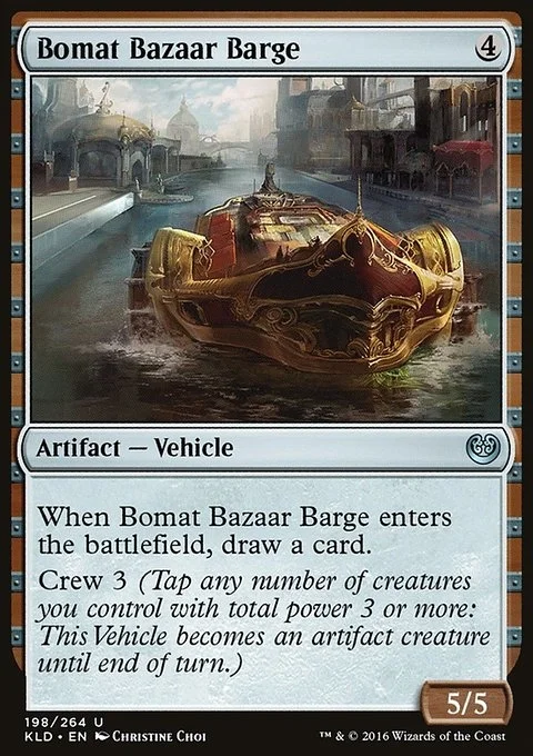 When Bomat Bazaar Barge enters the battlefield, draw a card. Crew 3 (Tap any number of creatures you control with total power 3 or more: This Vehicle becomes an artifact creature until end of turn.)