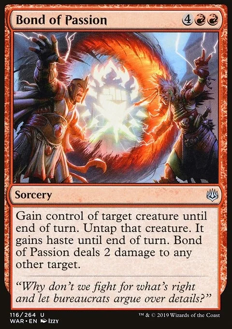 Gain control of target creature until end of turn. Untap that creature. It gains haste until end of turn. Bond of Passion deals 2 damage to any other target.