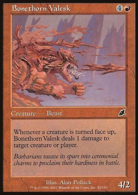 Whenever a permanent is turned face up, Bonethorn Valesk deals 1 damage to any target.