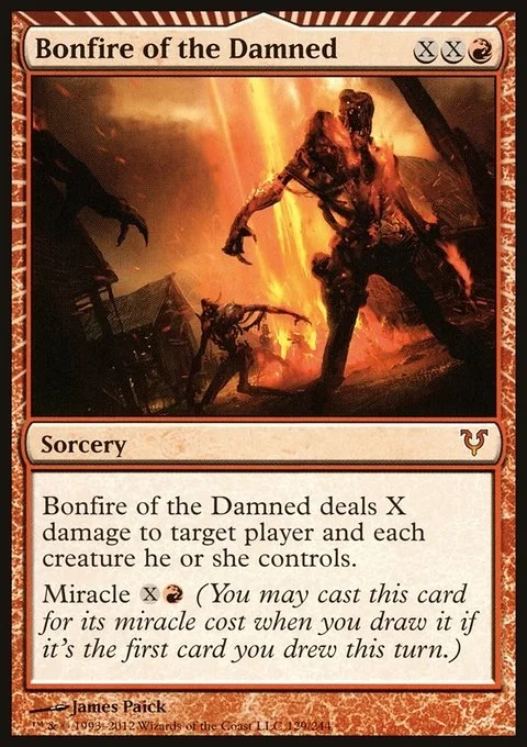 Bonfire of the Damned deals X damage to target player or planeswalker and each creature that player or that planeswalker's controller controls. Miracle {X}{R} (You may cast this card for its miracle cost when you draw it if it's the first card you drew this turn.)