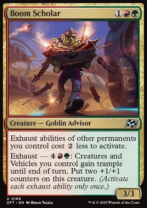 Exhaust abilities of other permanents you control cost {2} less to activate. Exhaust — {4}{R}{G}: Creatures and Vehicles you control gain trample until end of turn. Put two +1/+1 counters on this creature. (Activate each exhaust ability only once.)