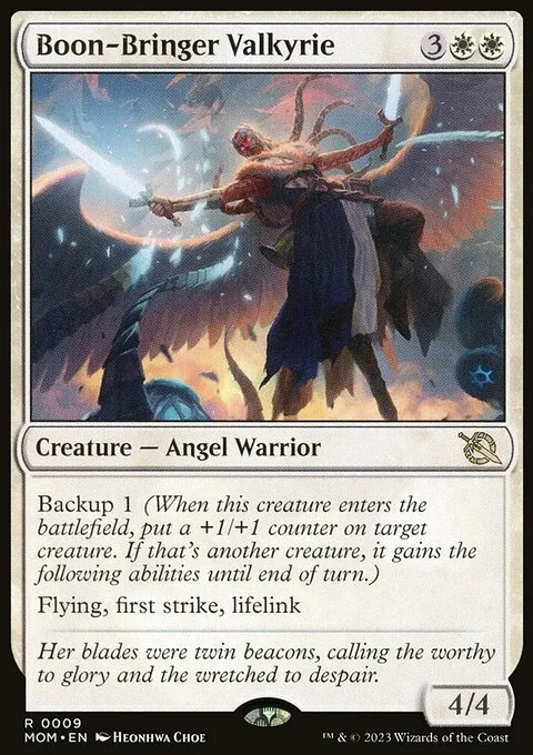 Backup 1 (When this creature enters, put a +1/+1 counter on target creature. If that's another creature, it gains the following abilities until end of turn.) Flying, first strike, lifelink