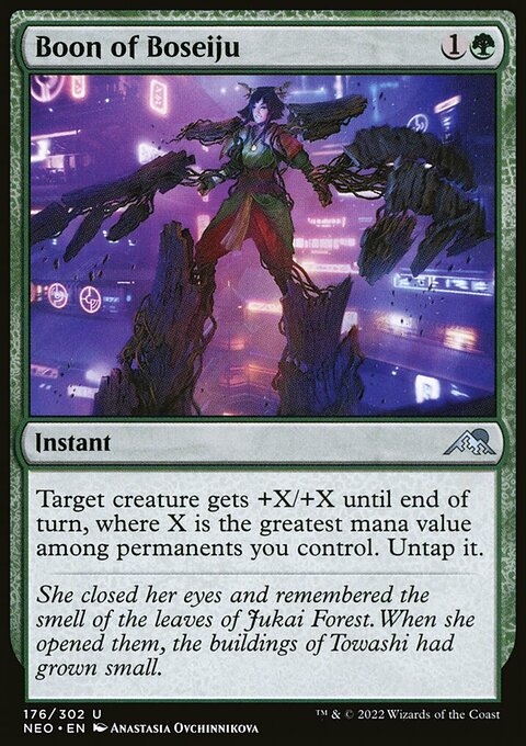 Target creature gets +X/+X until end of turn, where X is the greatest mana value among permanents you control. Untap it.