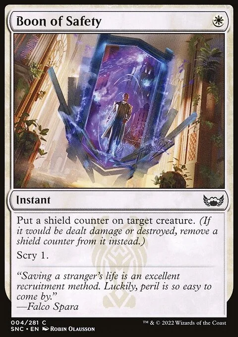 Put a shield counter on target creature. (If it would be dealt damage or destroyed, remove a shield counter from it instead.) Scry 1.