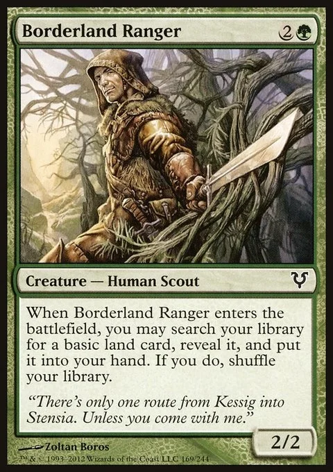 When Borderland Ranger enters the battlefield, you may search your library for a basic land card, reveal it, and put it into your hand. If you do, shuffle your library.