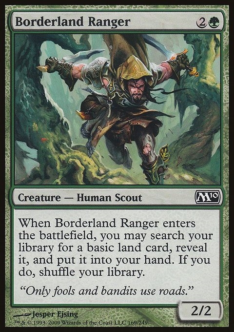 When Borderland Ranger enters the battlefield, you may search your library for a basic land card, reveal it, and put it into your hand. If you do, shuffle your library.
