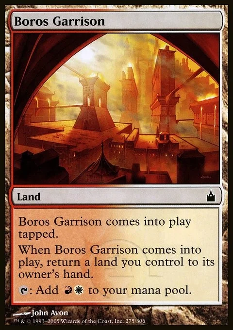 Boros Garrison enters tapped. When Boros Garrison enters, return a land you control to its owner's hand. {T}: Add {R}{W}.