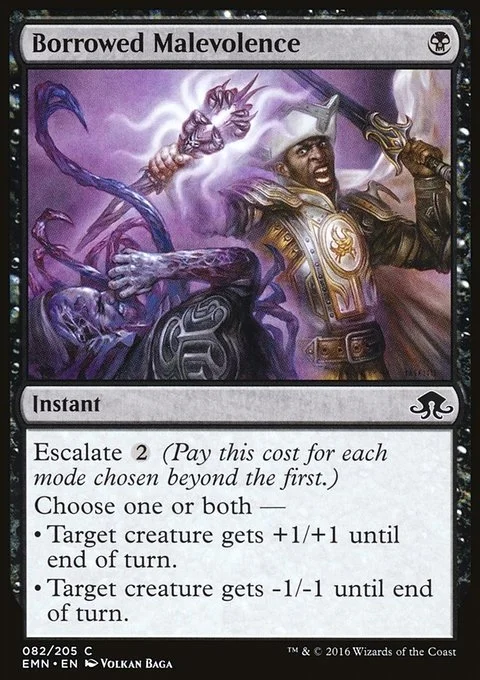 Escalate {2} (Pay this cost for each mode chosen beyond the first.) Choose one or both — • Target creature gets +1/+1 until end of turn. • Target creature gets -1/-1 until end of turn.