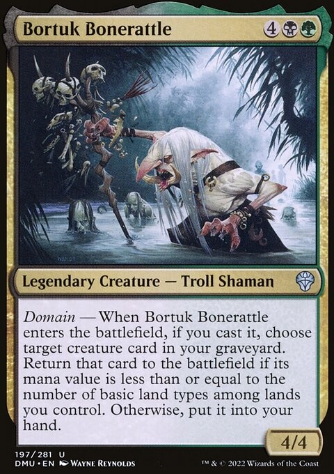 Domain — When Bortuk Bonerattle enters the battlefield, if you cast it, choose target creature card in your graveyard. Return that card to the battlefield if its mana value is less than or equal to the number of basic land types among lands you control. Otherwise, put it into your hand.