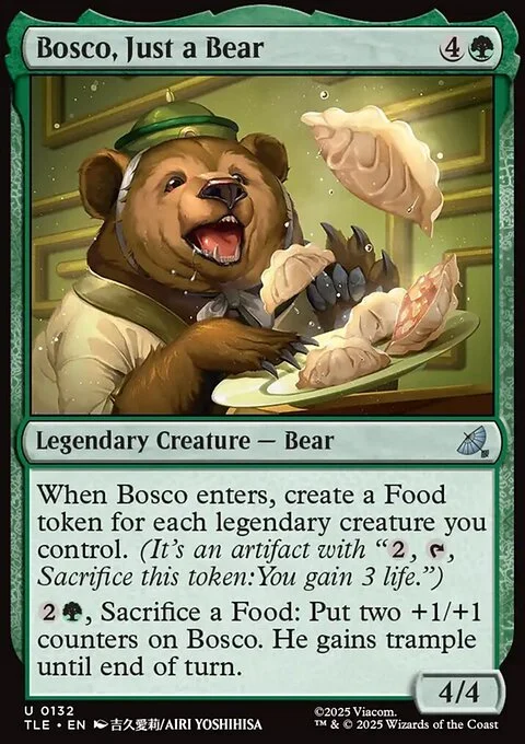 When Bosco enters, create a Food token for each legendary creature you control. (It's an artifact with "{2}, {T}, Sacrifice this token: You gain 3 life.") {2}{G}, Sacrifice a Food: Put two +1/+1 counters on Bosco. He gains trample until end of turn.