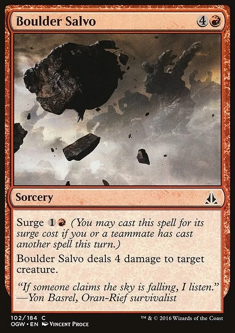 Surge {1}{R} (You may cast this spell for its surge cost if you or a teammate has cast another spell this turn.) Boulder Salvo deals 4 damage to target creature.