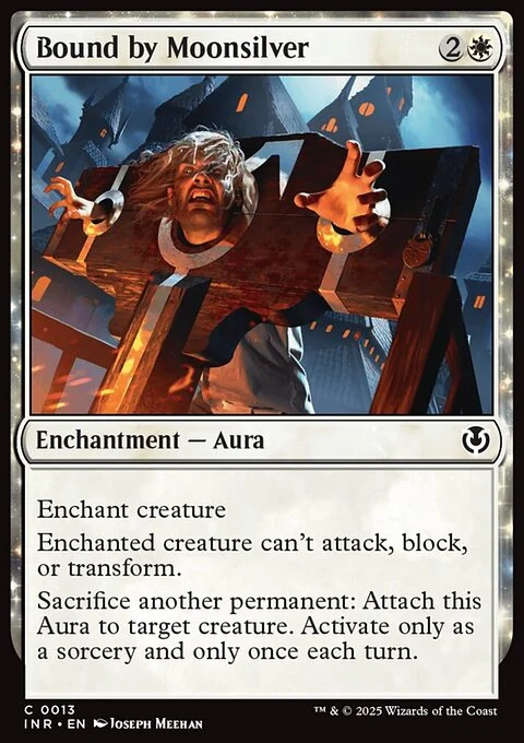 Enchant creature Enchanted creature can't attack, block, or transform. Sacrifice another permanent: Attach this Aura to target creature. Activate only as a sorcery and only once each turn.