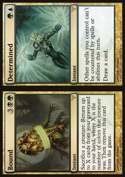 Bound Sacrifice a creature. Return up to X cards from your graveyard to your hand, where X is the number of colors that creature was. Exile this card. Determined Other spells you control can't be countered this turn. Draw a card.