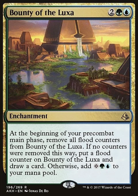 At the beginning of your precombat main phase, remove all flood counters from Bounty of the Luxa. If no counters were removed this way, put a flood counter on Bounty of the Luxa and draw a card. Otherwise, add {C}{G}{U}.