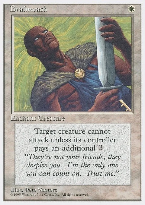 Enchant creature Enchanted creature can't attack unless its controller pays {3}.