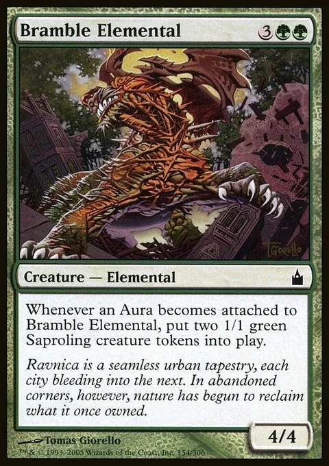 Whenever an Aura becomes attached to Bramble Elemental, create two 1/1 green Saproling creature tokens.