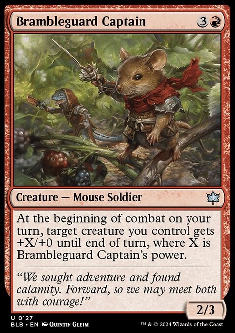 At the beginning of combat on your turn, target creature you control gets +X/+0 until end of turn, where X is Brambleguard Captain's power.