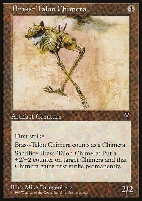 First Strike, Brass-Talon Chimera counts as a Chimera.Sacrifice Brass-Talon Chimera: Put a +2/+2 counter on target Chimera and that Chimera gains first strike permanently.