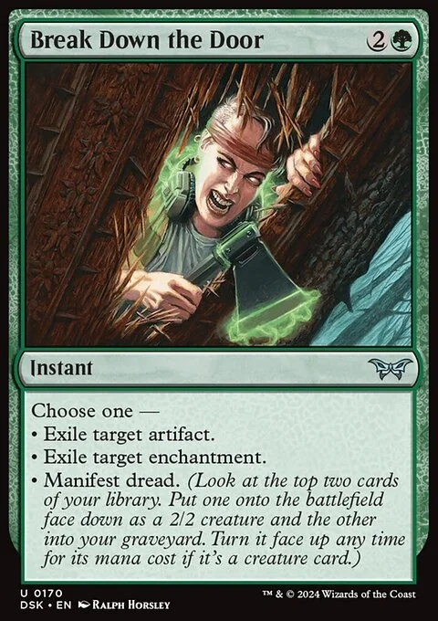 Choose one — • Exile target artifact. • Exile target enchantment. • Manifest dread. (Look at the top two cards of your library. Put one onto the battlefield face down as a 2/2 creature and the other into your graveyard. Turn it face up any time for its mana cost if it's a creature card.)