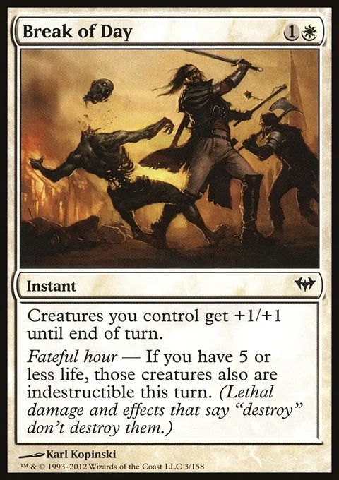 Creatures you control get +1/+1 until end of turn. Fateful hour — If you have 5 or less life, those creatures gain indestructible until end of turn. (Damage and effects that say "destroy" don't destroy them.)