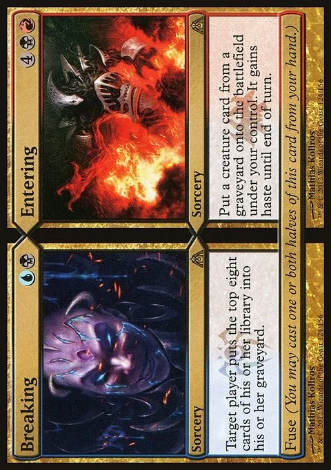 Breaking Target player puts the top eight cards of their library into their graveyard. Fuse (You may cast one or both halves of this card from your hand.) Entering Put a creature card from a graveyard onto the battlefield under your control. It gains haste until end of turn. Fuse (You may cast one or both halves of this card from your hand.)