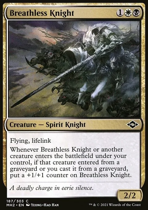 Flying, lifelink Whenever Breathless Knight or another creature enters the battlefield under your control, if that creature entered from a graveyard or you cast it from a graveyard, put a +1/+1 counter on Breathless Knight.