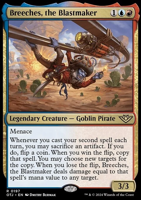 Whenever you cast your second spell each turn, you may sacrifice an artifact. If you do, flip a coin. When you win the flip, copy that spell. You may choose new targets for the copy. When you lose the flip, Breeches, the Blastmaker deals damage equal to that spell's mana value to any target.