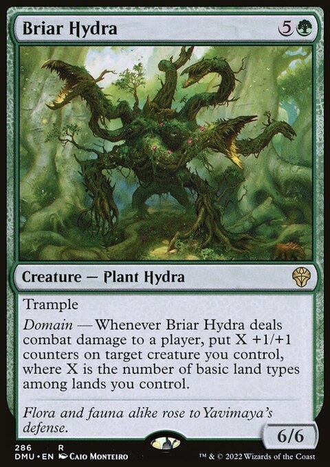 Trample Domain — Whenever Briar Hydra deals combat damage to a player, put X +1/+1 counters on target creature you control, where X is the number of basic land types among lands you control.