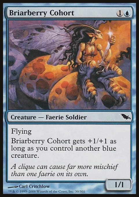 Flying Briarberry Cohort gets +1/+1 as long as you control another blue creature.