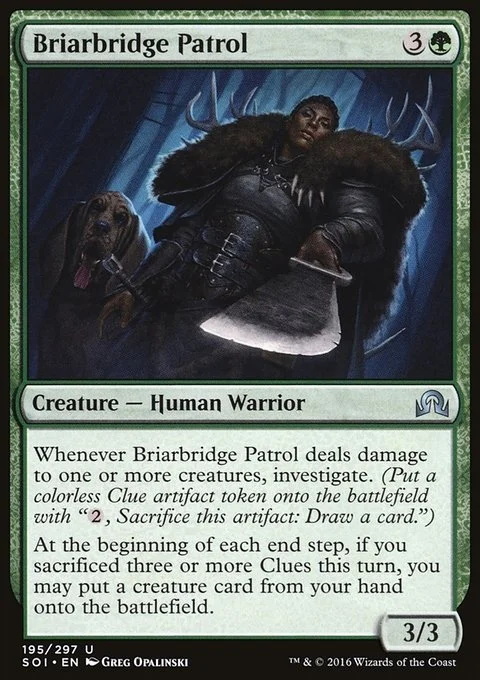 Whenever Briarbridge Patrol deals damage to one or more creatures, investigate. (Create a colorless Clue artifact token with "{2}, Sacrifice this artifact: Draw a card.")