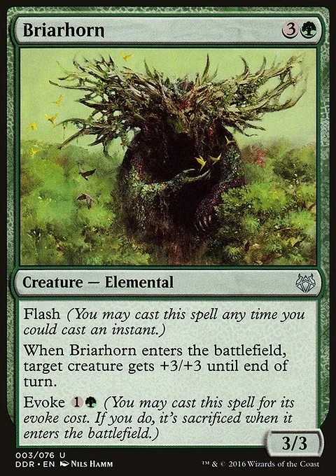 Flash When Briarhorn enters, target creature gets +3/+3 until end of turn. Evoke {1}{G} (You may cast this spell for its evoke cost. If you do, it's sacrificed when it enters.)