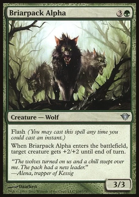 Flash (You may cast this spell any time you could cast an instant.) When Briarpack Alpha enters the battlefield, target creature gets +2/+2 until end of turn.