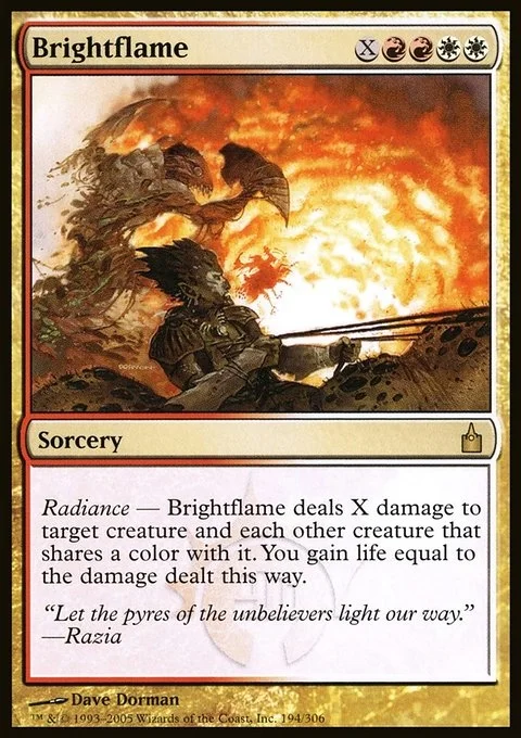 Radiance — Brightflame deals X damage to target creature and each other creature that shares a color with it. You gain life equal to the damage dealt this way.