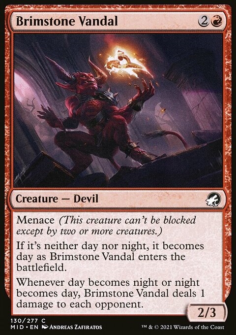 Whenever day becomes night or night becomes day, Brimstone Vandal deals 1 damage to each opponent.