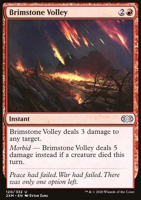 Brimstone Volley deals 3 damage to any target. Morbid — Brimstone Volley deals 5 damage instead if a creature died this turn.