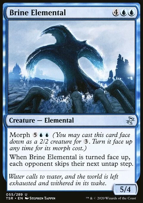 Morph {5}{U}{U} (You may cast this card face down as a 2/2 creature for {3}. Turn it face up any time for its morph cost.) When Brine Elemental is turned face up, each opponent skips their next untap step.