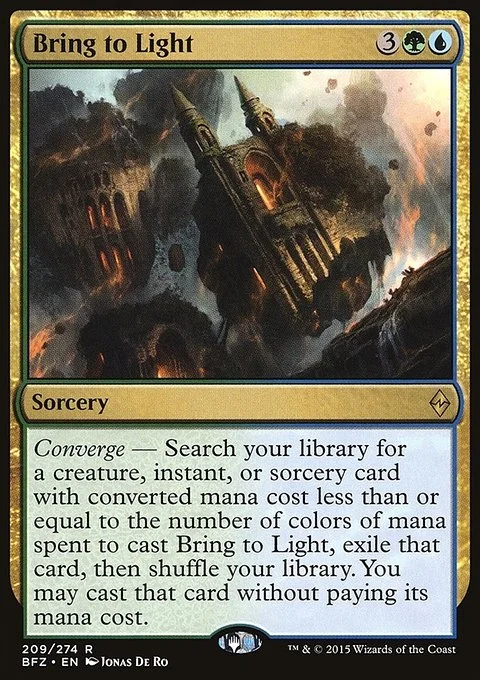 Converge — Search your library for a creature, instant, or sorcery card with mana value less than or equal to the number of colors of mana spent to cast this spell, exile that card, then shuffle. You may cast that card without paying its mana cost.