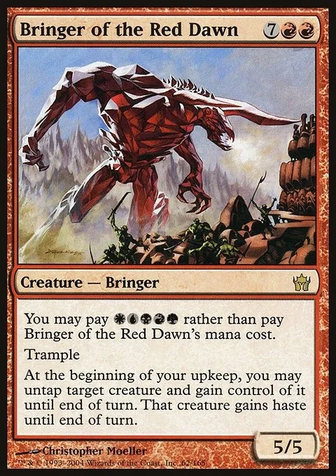 You may pay {W}{U}{B}{R}{G} rather than pay this spell's mana cost. Trample At the beginning of your upkeep, you may untap target creature and gain control of it until end of turn. That creature gains haste until end of turn.
