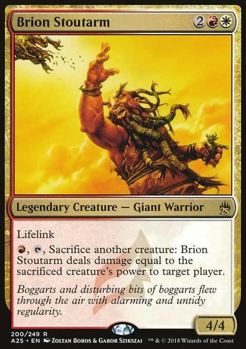 Lifelink {R}, {T}, Sacrifice another creature: Brion Stoutarm deals damage equal to the sacrificed creature's power to target player or planeswalker.