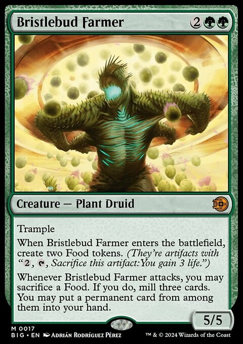 When Bristlebud Farmer enters, create two Food tokens. (They're artifacts with "{2}, {T}, Sacrifice this artifact: You gain 3 life.")