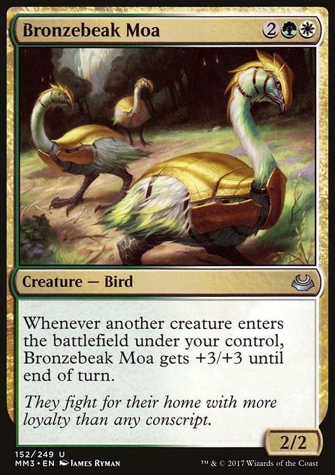 Whenever another creature enters the battlefield under your control, Bronzebeak Moa gets +3/+3 until end of turn.