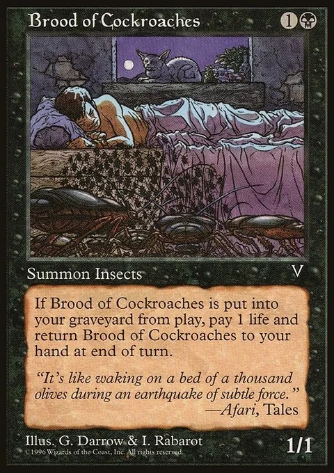 If Brood of Cockroaches is put into your graveyard from play, pay 1 life and return Brood of Cockroaches to your hand at end of turn.