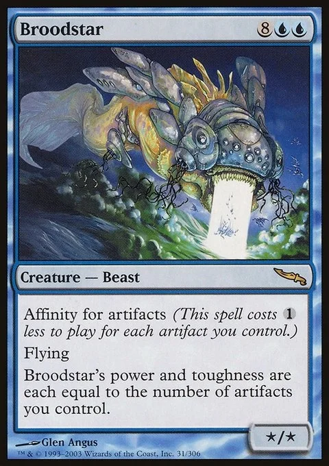 Affinity for artifacts (This spell costs {1} less to cast for each artifact you control.) Flying Broodstar's power and toughness are each equal to the number of artifacts you control.
