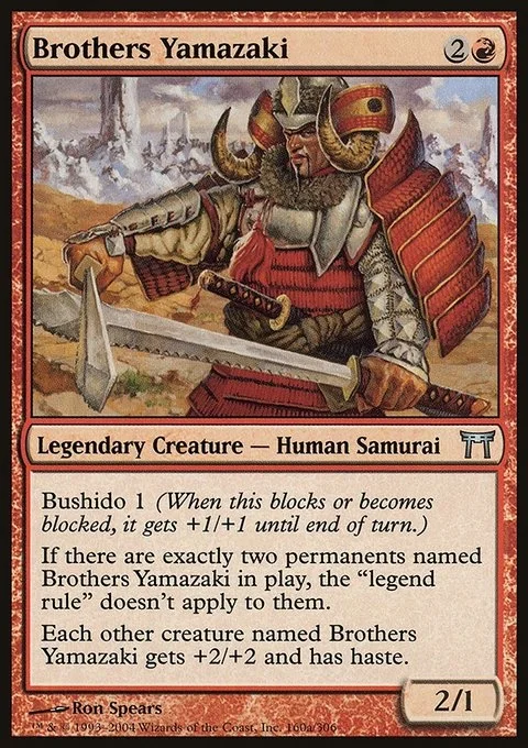 Each other creature named Brothers Yamazaki gets +2/+2 and has haste.