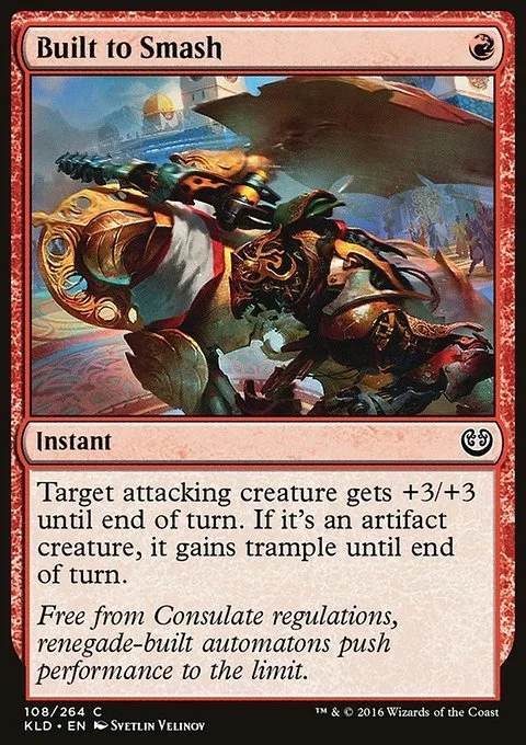 Target attacking creature gets +3/+3 until end of turn. If it's an artifact creature, it gains trample until end of turn.