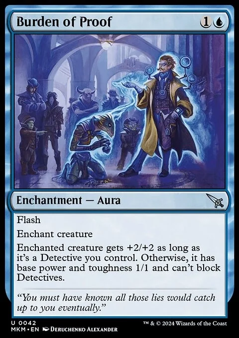 Flash Enchant creature Enchanted creature gets +2/+2 as long as it's a Detective you control. Otherwise, it has base power and toughness 1/1 and can't block Detectives.