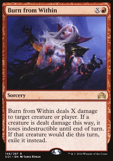 Burn from Within deals X damage to any target. If a creature is dealt damage this way, it loses indestructible until end of turn. If that creature would die this turn, exile it instead.