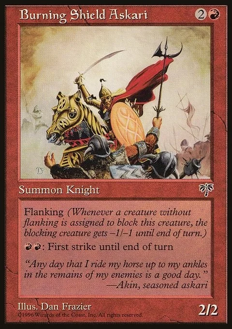 Flanking (Whenever a creature without flanking blocks this creature, the blocking creature gets -1/-1 until end of turn.) {R}{R}: Burning Shield Askari gains first strike until end of turn.