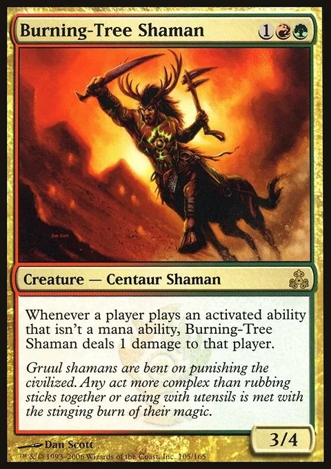 Whenever a player activates an ability that isn't a mana ability, Burning-Tree Shaman deals 1 damage to that player.