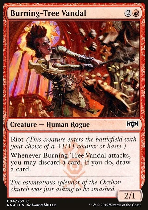 Riot (This creature enters with your choice of a +1/+1 counter or haste.) Whenever this creature attacks, you may discard a card. If you do, draw a card.